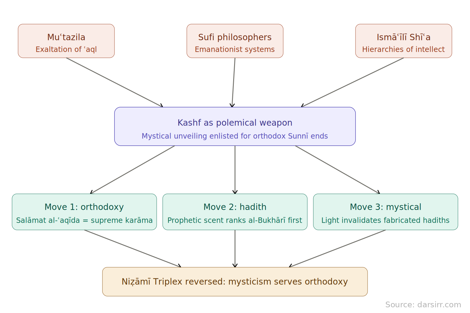 Diagram showing how Al-Ibrīz deploys kashf as a polemical weapon against the Muʿtazila, Sufi philosophers, and Ismāʿīlī Shīʿa through three successive moves — orthodoxy, hadith, and mystical invalidation — reversing the Niẓāmī Triplex so that mysticism serves rather than transcends Sunnī orthodoxy.